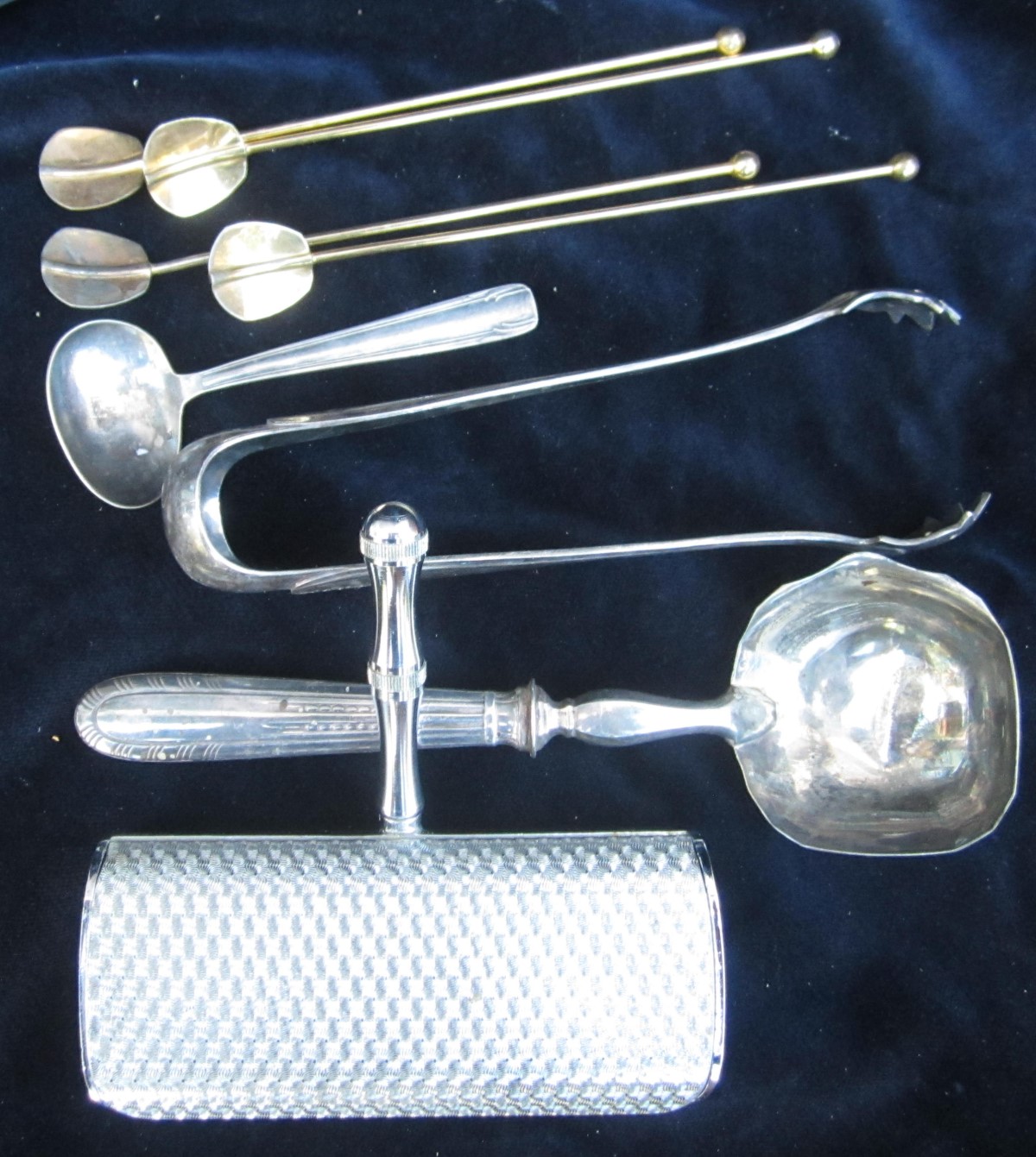 Lot d’objets vintage d’occasion fin 20ème siècle: une cuillère, une louche argentée, un ramasse miette, 4 touilleurs et une pince à sucre.