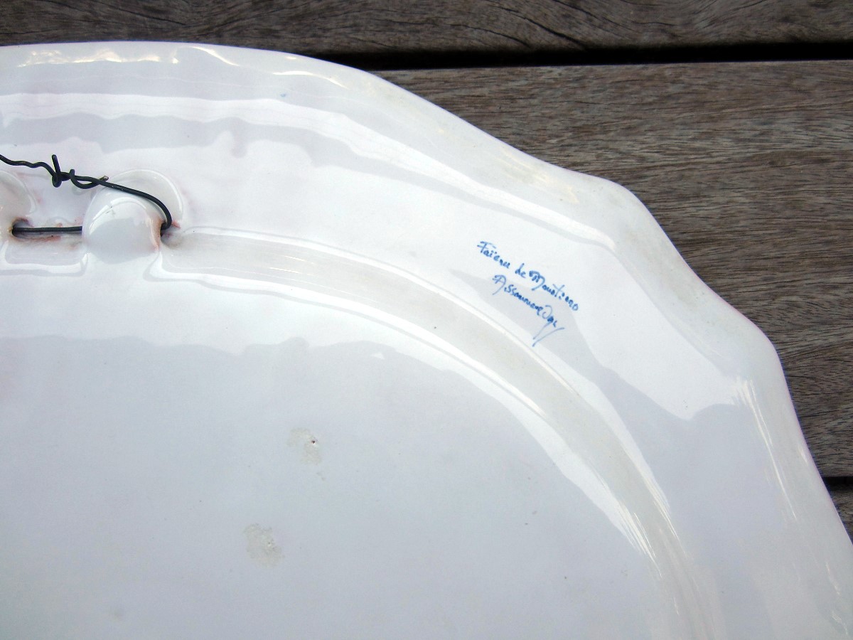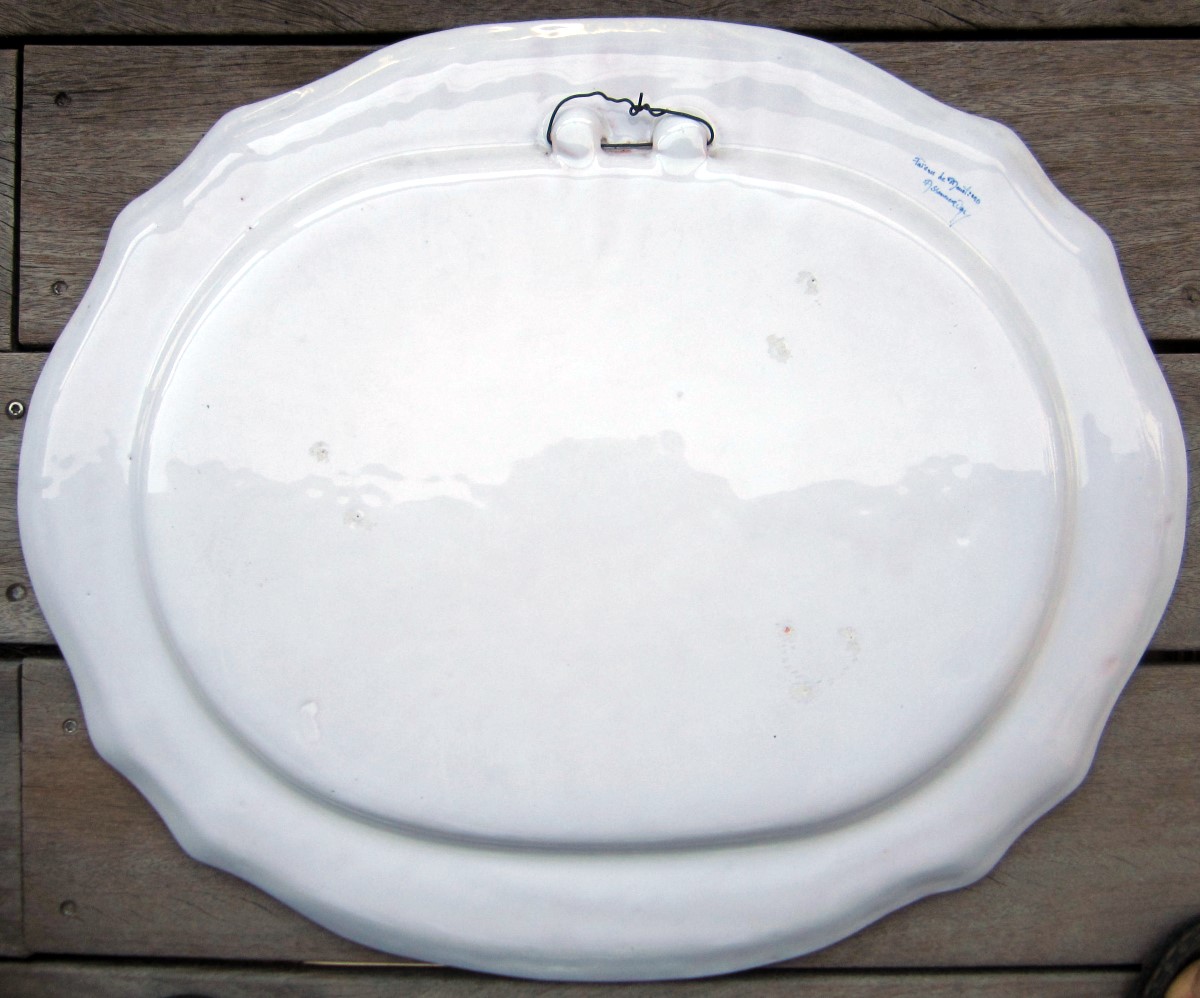 L 53cm * l 45cm Très grand plat ovale à bord chantourné, décor en camaïeu bleu à scène mythologique. L’aile est recouverte de lambrequins et de mascarons alternés. Andromède fille de Cassiopée reine d’Ethiopie fut livrée à un monstre marin. Persée passant par là, la délivre du danger, en blousant le monstre, l’épouse et s’en retourne chez Acrize son grand-père. Les pièces d’époque début XVIIIe sont attribuées selon les historiens, soit à Pierre Clérissy de Moustiers soit à Joseph Clérissy (son frère) installé à Saint-Jean du Désert (faubourg de Marseille) Un plat rond du XVIIIe siècle avec cette scène simplifiée et relativement naïve est exposé au Musée national de la Céramique à Sèvres en France. Faïence de Moustiers façonnée et peinte à la main délivrée avec son certificat d’authenticité. Une accroche murale est incorporée au dos du plat; il est signé: Faïence de Moustiers à St Sauveur Oguy qui est l’abréviation de mon nom et prénom: Oréglia Guy.